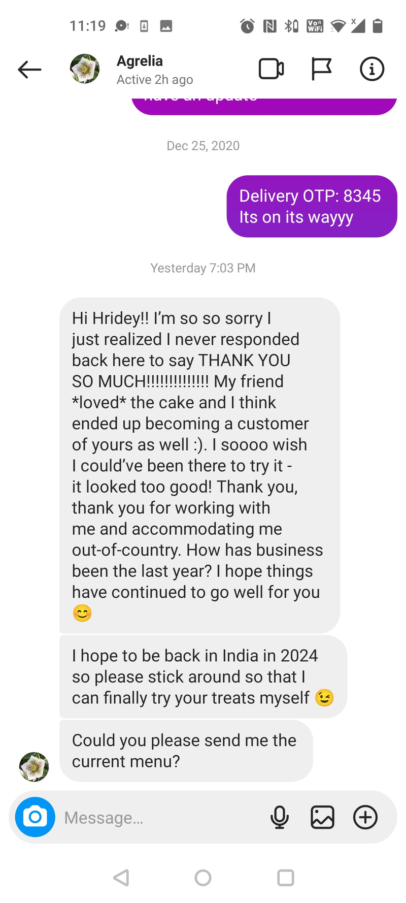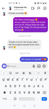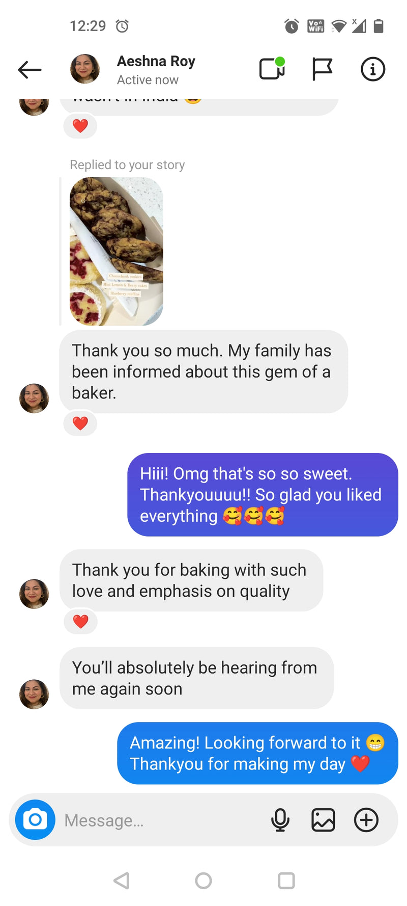 "Everything was superb. I cannot get over the lemon raspberry cake it tasted like I wasn't in India! Thank you for baking with such love and emphasis on quality. My family has been informed about this gem of a baker, and you'll absolutely be hearing from me again soon."