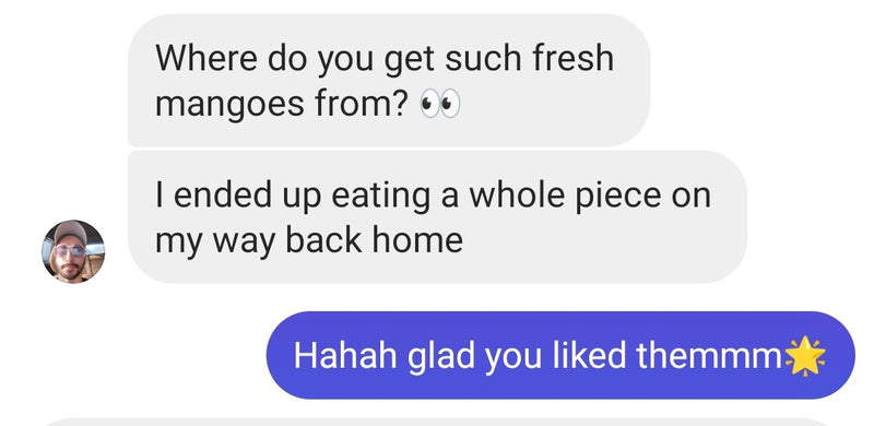 "Where do you get such fresh mangoes from? I ended up eating a whole piece on my way back home."