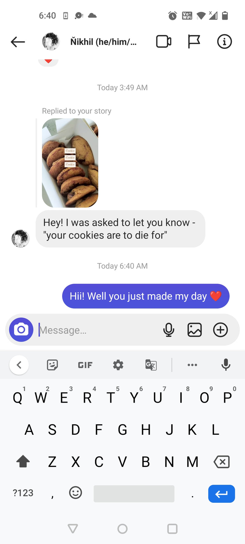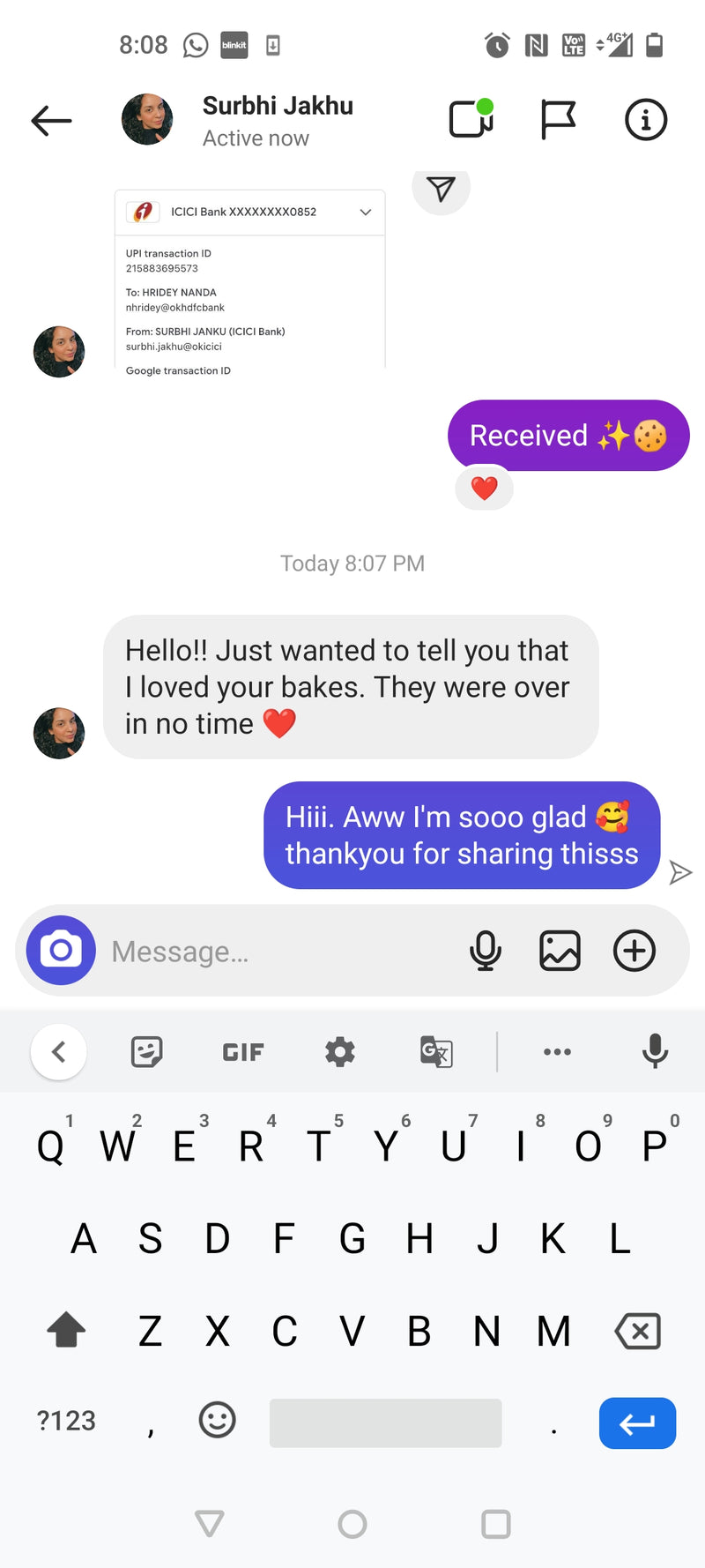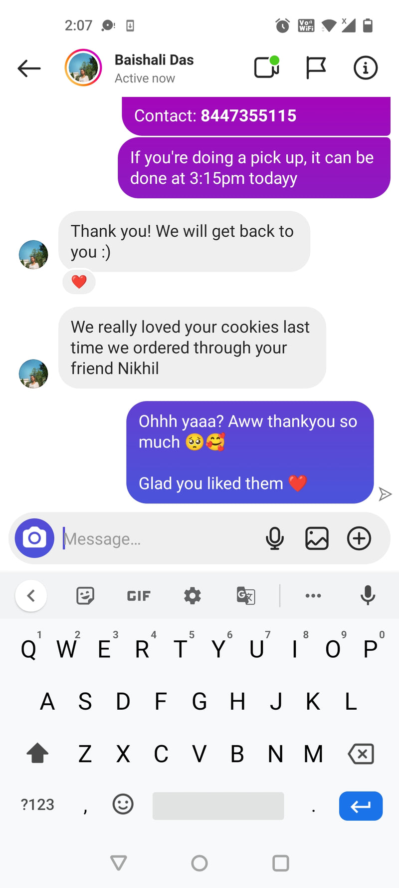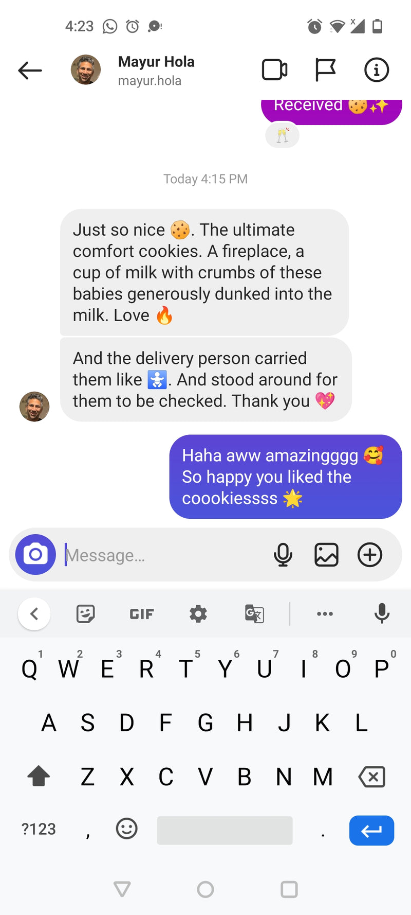 "Hey, the cookies were lovely. Thank you! ❤️"