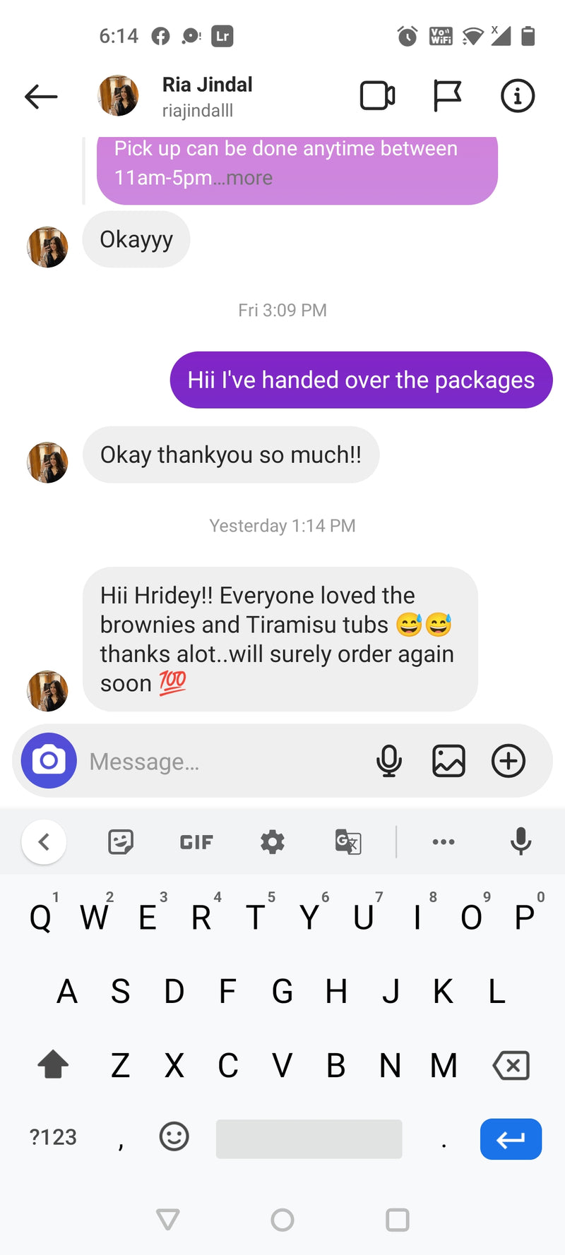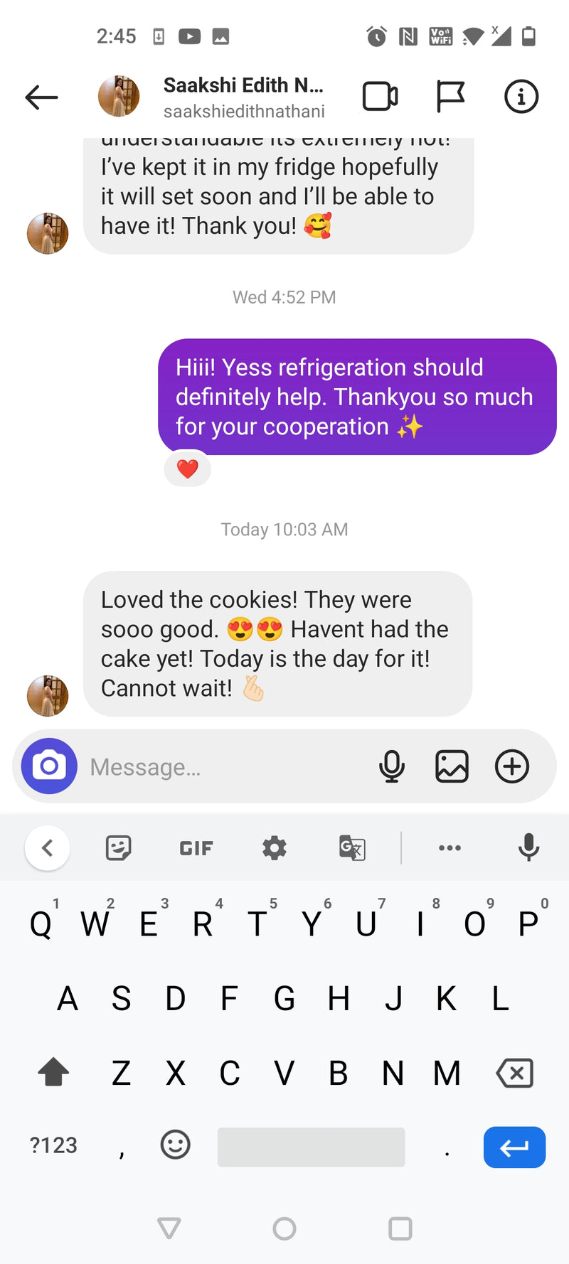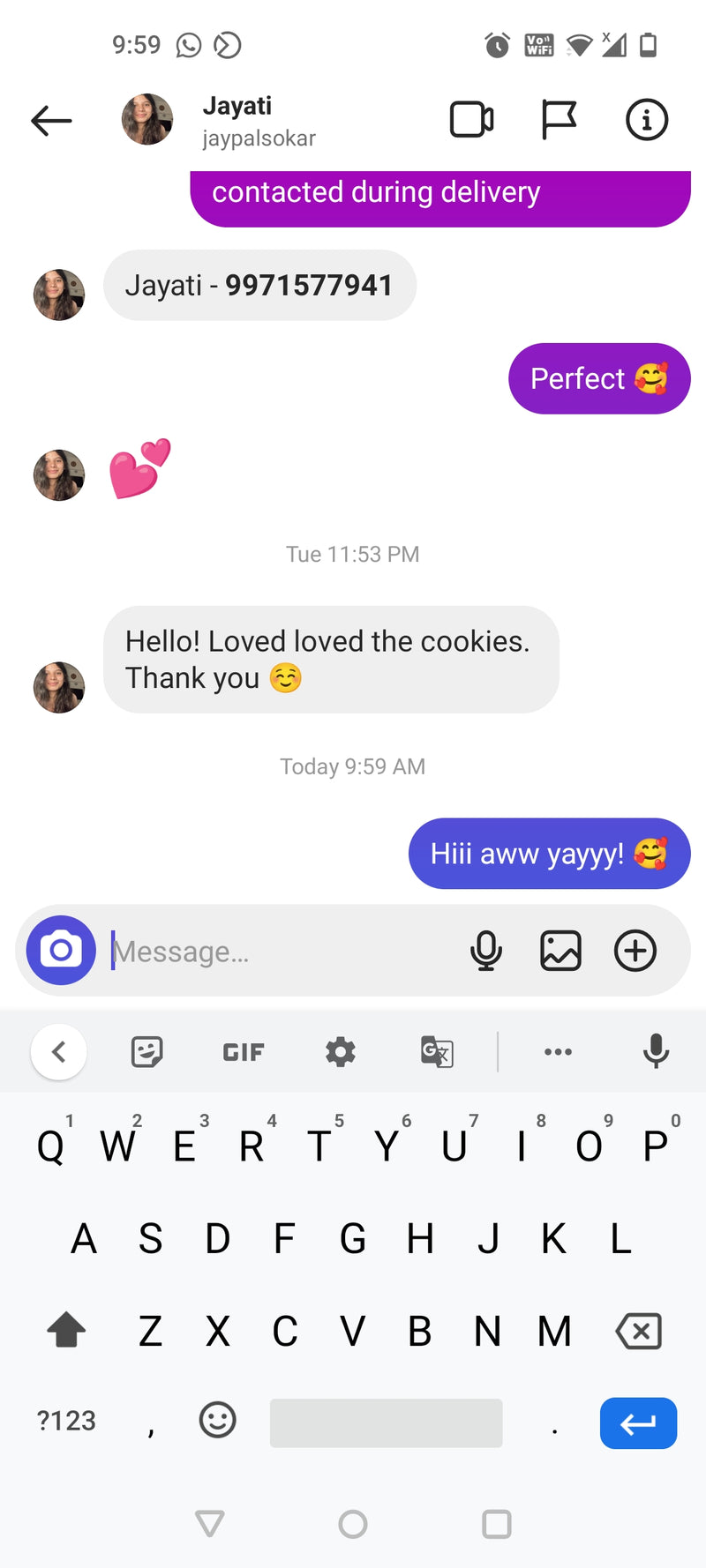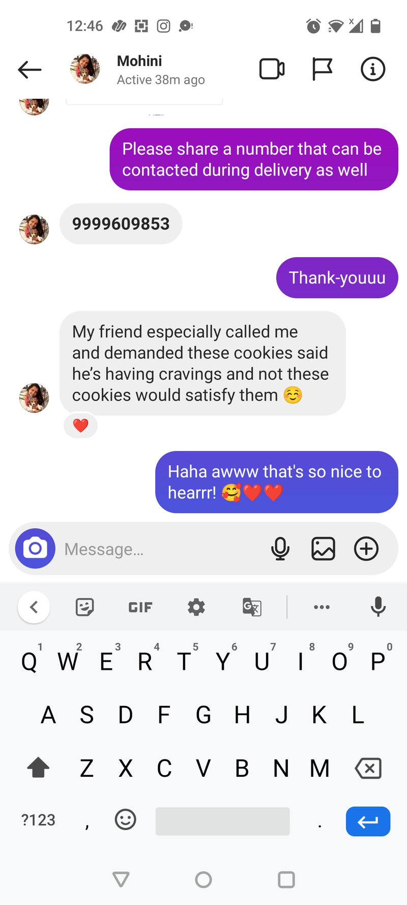 "Hey, the cookies were lovely. Thank you! ❤️"