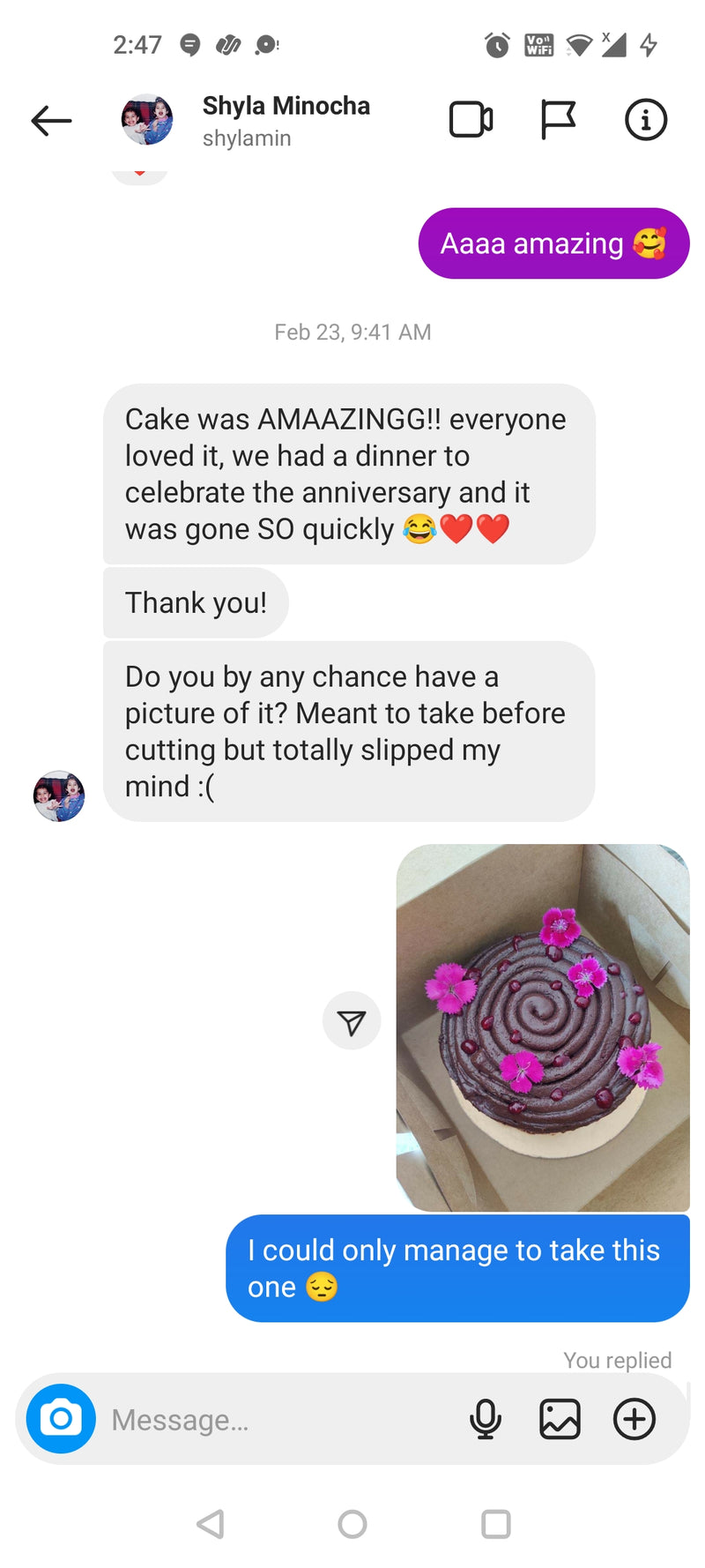 "Cake was AMAAZINGG!! everyone loved it, we had a dinner to celebrate the anniversary and it was gone SO quickly 😂❤️ Thank you!"